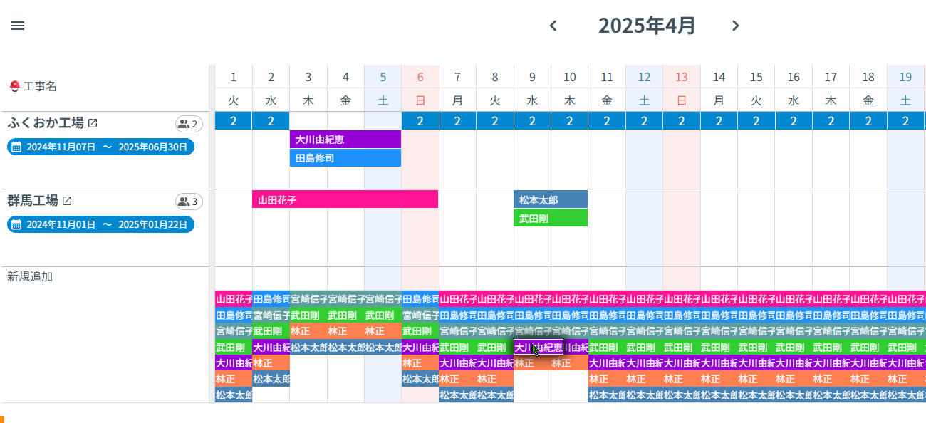 ガントチャート形式で人員配置が出来るプラグインです。人員管理、シフト管理、プロジェクト管理など様々な用途で活用できる設計にしています。